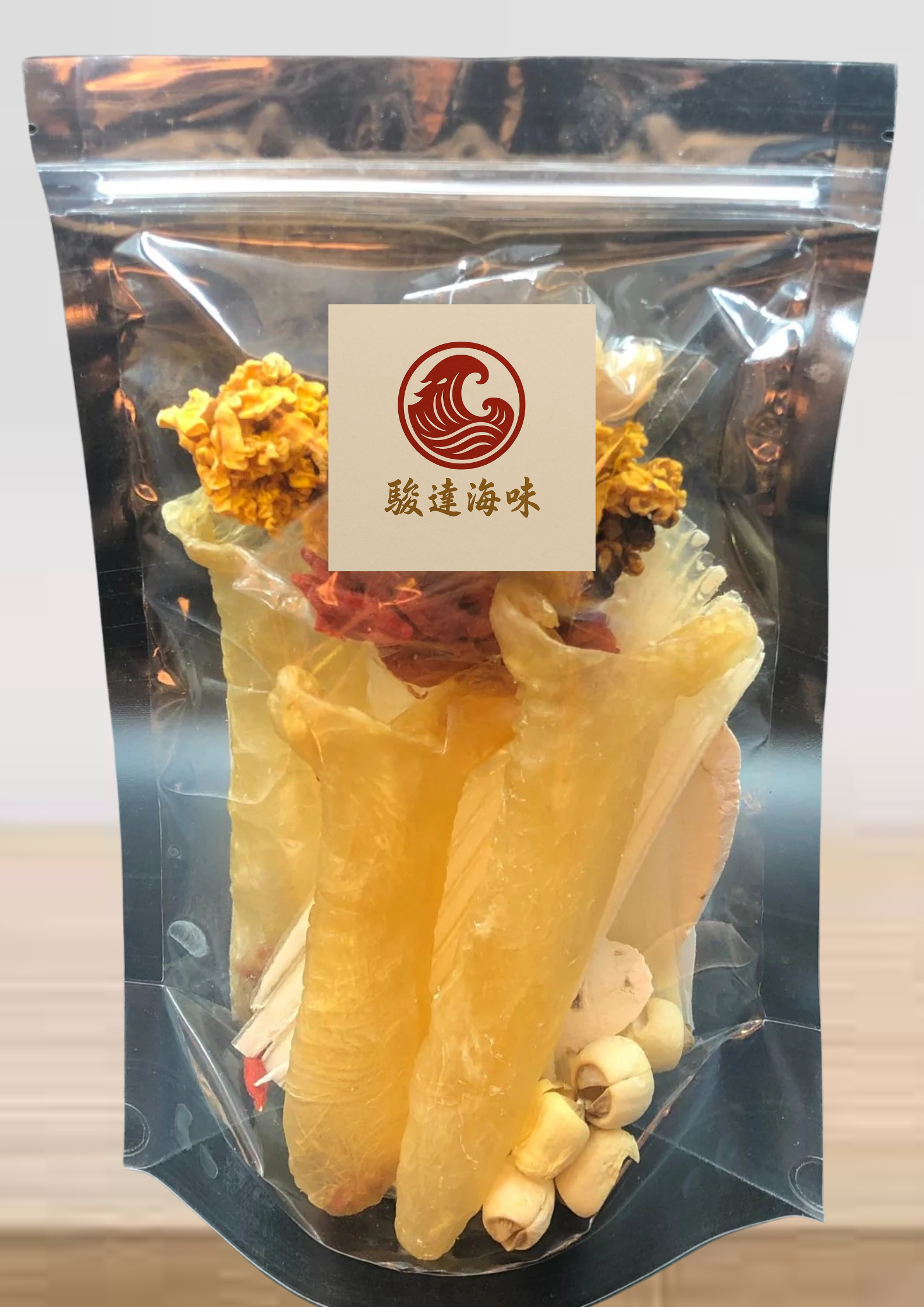 | 成份: | 花膠、鯊魚骨、金磚黃耳、杞子、元肉、無磺淮山、蓮子(所有成份會因季節及貨源而有所調整) |